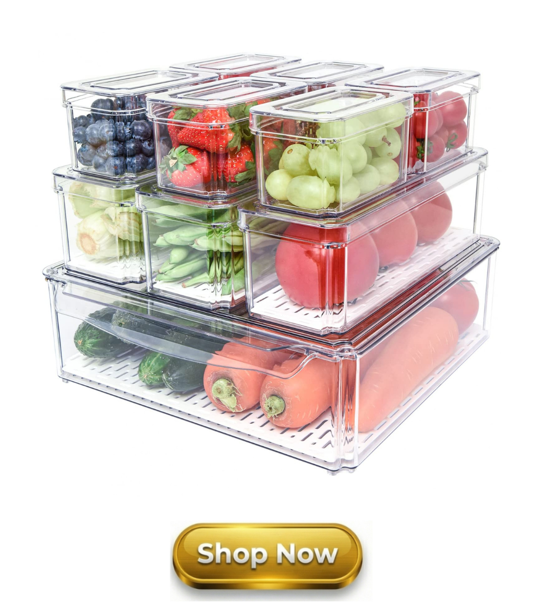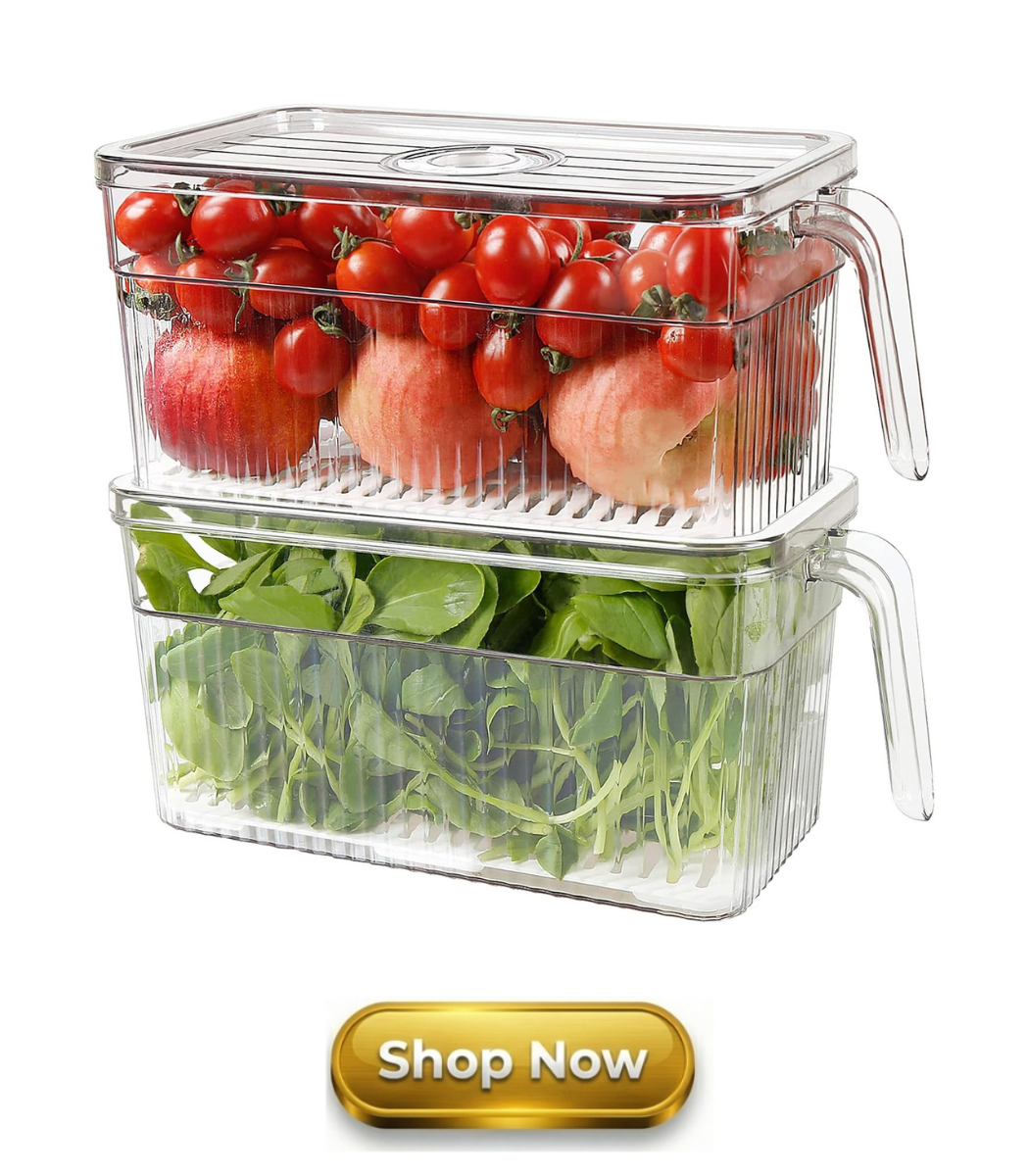 These stackable produce bins keep fruits and veggies fresh longer with a drain tray, sturdy handles, and easy fridge organization.