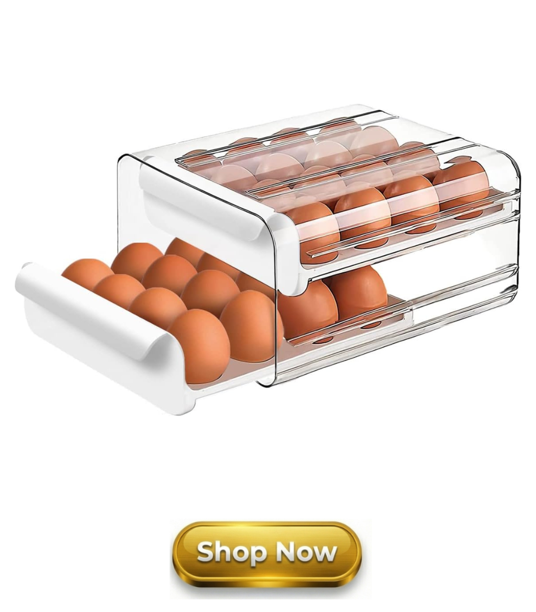 This 2-drawer egg holder stores up to 32 eggs, saves fridge space, and keeps eggs protected, organized, and easy to access.