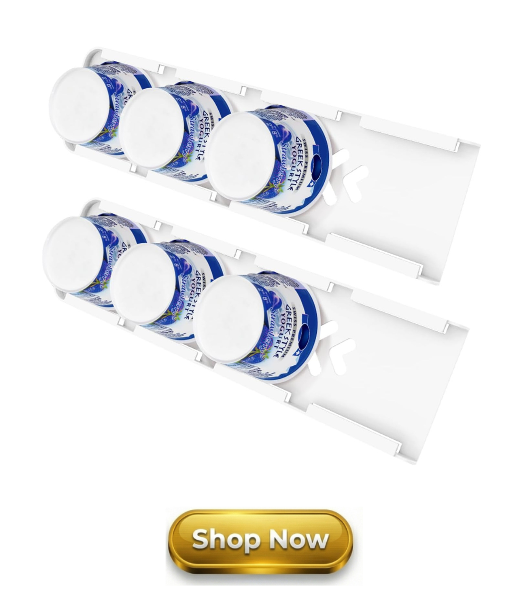This yogurt organizer holds up to 4 cups, saves fridge space, and keeps your yogurt neatly stored and easy to grab.